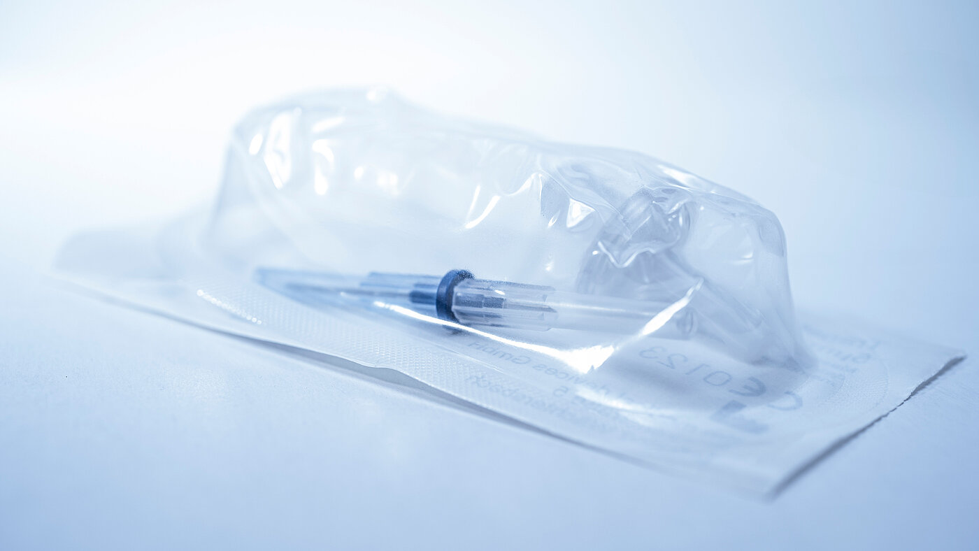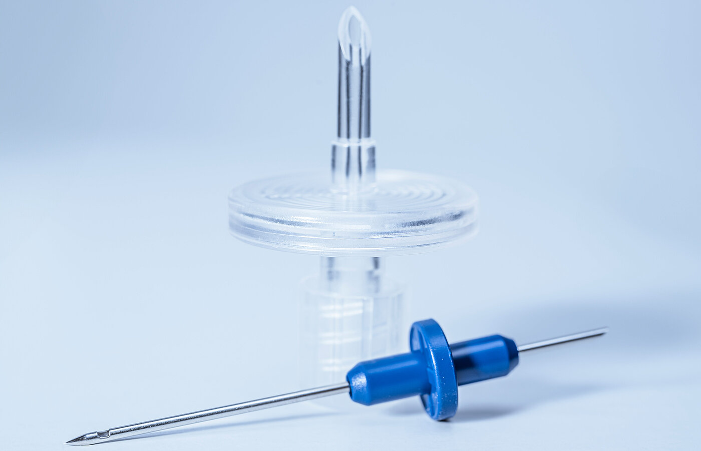 The blue sfm transfer device is a functional guided transfer system for reconstituting lyophilisates. Off-center vial placement is prevented by specially designed molding making this device especially easy to use. It incorporated cannula has a pencil point tip making the vials elastomeric seal easier to puncture as well as reducing the risk of punching out seal material.